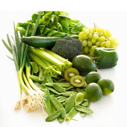 Acelgas, brécol, espinacas, lechuga, guisantes, judías verdes, apio, alcachofas, algas marinas verdes, aguacate, cilantro, perejil, pimientos, col, kiwi, pepino, té verde, limón, infusiones de hierbas verdes, etc.