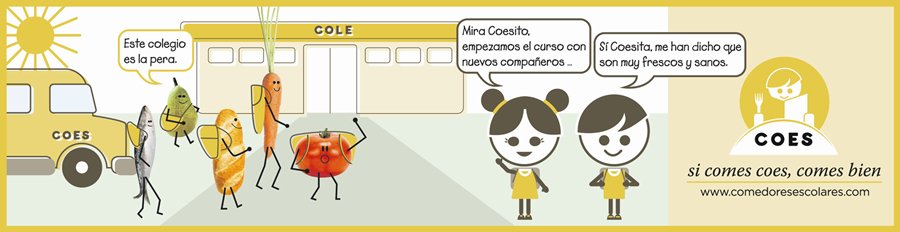Desde septiembre y para este curso escolar los comensales de Coes, van a estar acompañados activamente por: Coesito y Coesita, a través de estos dos simpáticos personajes, COES, pretende llegar a la población escolar y a los mas mayores, para que descubran que su alimentación y la nutrición, junto con la actividad física, son importantes todos los días del año.